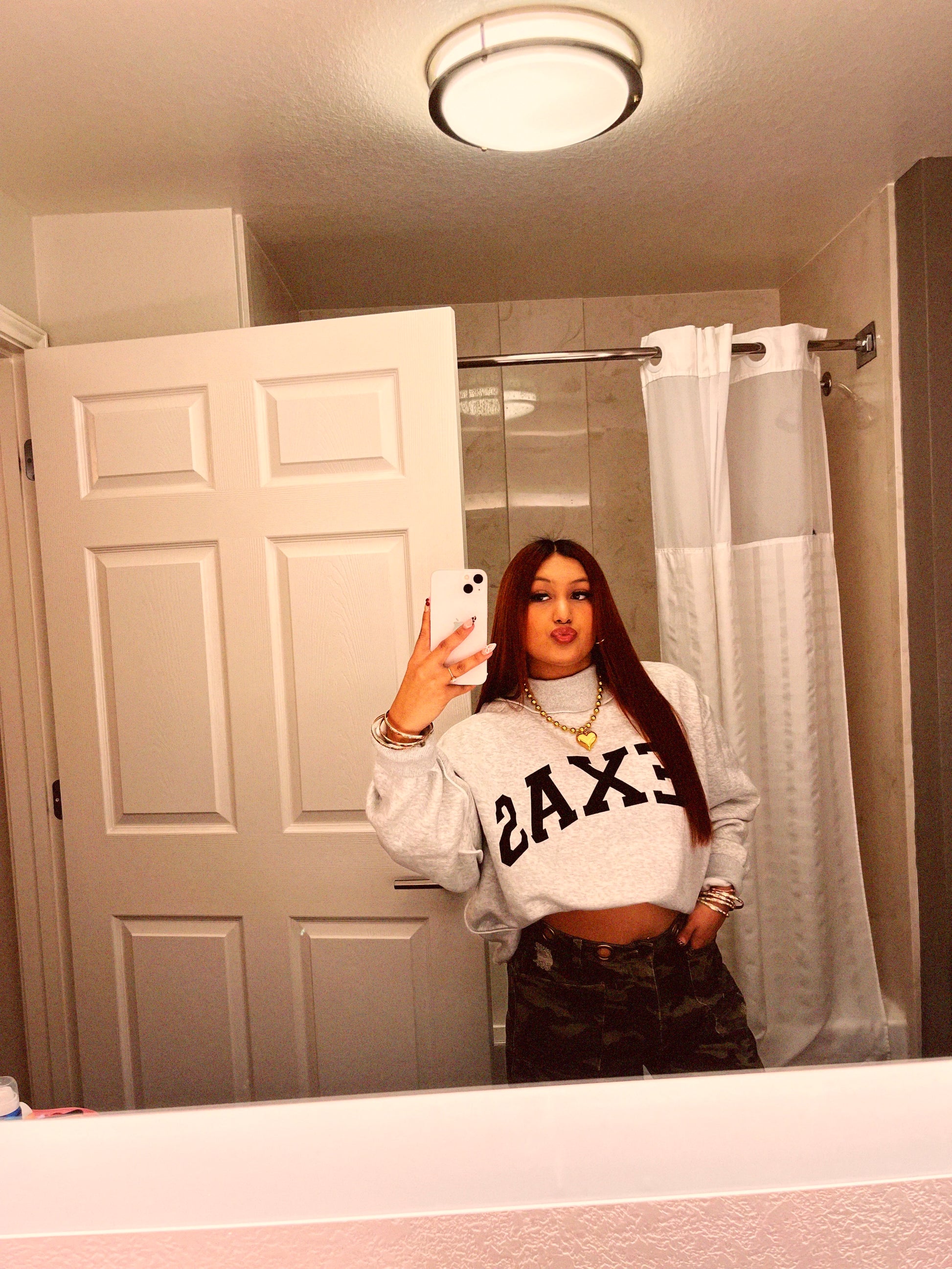 grey sweatshirt with black texas letters/ inside out with pink TX saying